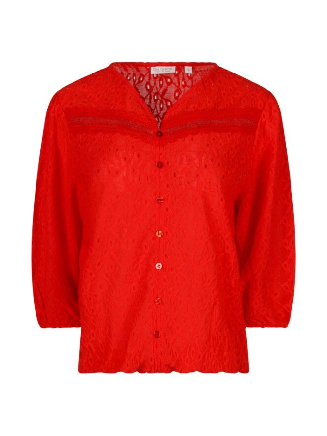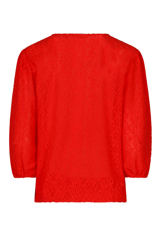 Deze elegante ajour top van So Soire uit de zomercollectie straalt vrouwelijkheid uit. De luchtige stof met fancy ajourmotief wordt stijlvol afgewerkt met kantdetails en sierknoopjes aan de voorkant. De korte pofmouwen en elastiek aan de mouwen en taille zorgen voor een mooie pasvorm. Dankzij de subtiele V-hals is deze top perfect voor zowel feestelijke gelegenheden als een verfijnde everyday look.