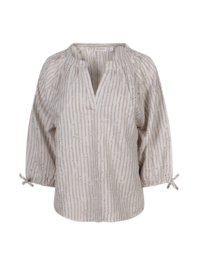 Mooie gestreepte blouse met broderie borduursel. Deze top van 100% katoen draagt als linnen op warme dagen en is daardoor zeer comfortabel te noemen. Draag hem voor een casual chique look op je favoriete jeans en laat de mouwen bollen door het elastiek.