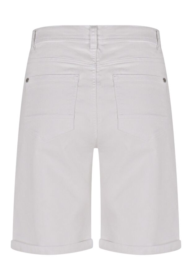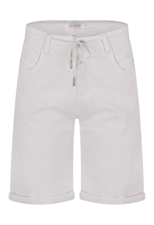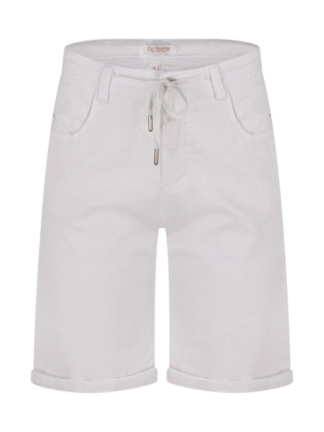 Deze korte damesbroek van So Soire is de perfecte mix van comfort en een trendy look. Gemaakt van zachte joggdenim met stretch, waardoor je geniet van optimale bewegingsvrijheid. Het koordje in de taille zorgt voor een sportieve touch en een verstelbare pasvorm. Met een effen design, rits- en knoopsluiting en praktische 4-pocket afwerking is deze broek ideaal voor zomerse dagen. Combineer ?m met een luchtige top of T-shirt voor een relaxte, casual outfit!