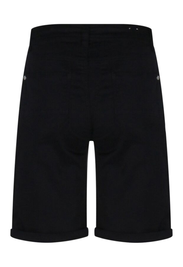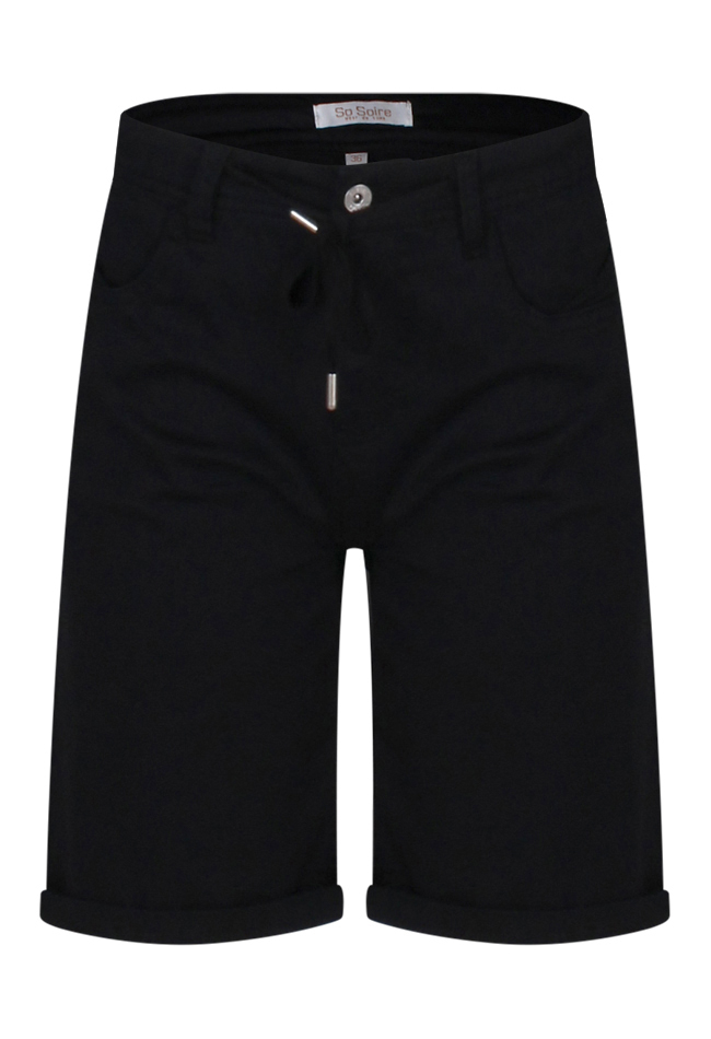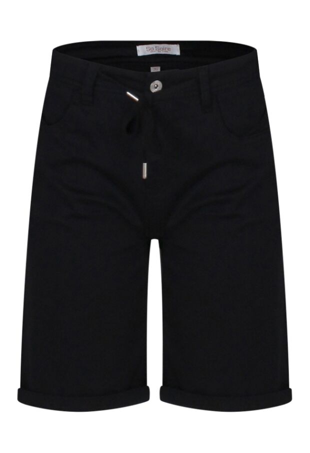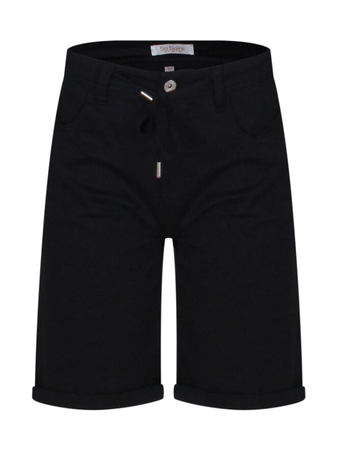 Deze korte damesbroek van So Soire is de perfecte mix van comfort en een trendy look. Gemaakt van zachte joggdenim met stretch, waardoor je geniet van optimale bewegingsvrijheid. Het koordje in de taille zorgt voor een sportieve touch en een verstelbare pasvorm. Met een effen design, rits- en knoopsluiting en praktische 4-pocket afwerking is deze broek ideaal voor zomerse dagen. Combineer ?m met een luchtige top of T-shirt voor een relaxte, casual outfit!