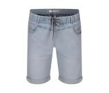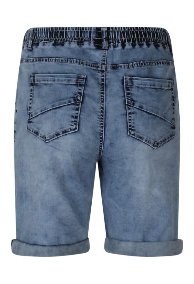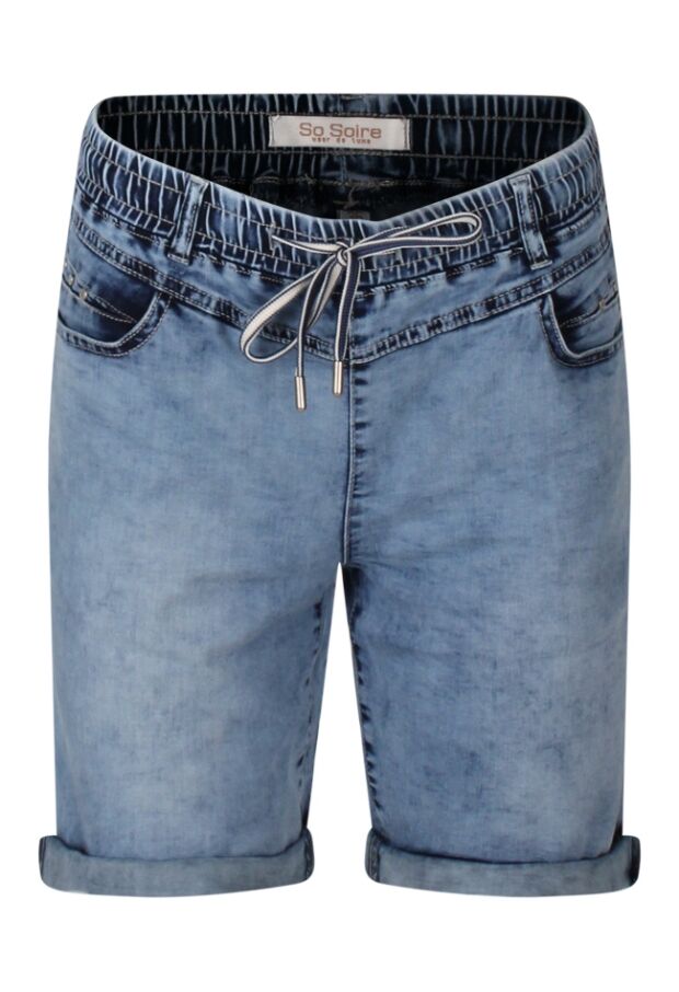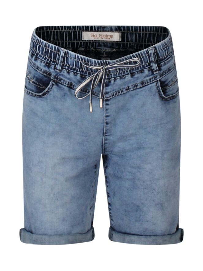 Deze denim short van So Soire combineert comfort met een casual, vrouwelijke uitstraling. De short is gemaakt van een soepele stretchdenim en voorzien van een elastische tailleband met koordje voor een relaxte pasvorm. De omgeslagen zomen geven het ontwerp een speelse touch, terwijl het 5-pocket model zorgt voor een tijdloze jeanslook. Perfect voor zonnige dagen en moeiteloze zomeroutfits.