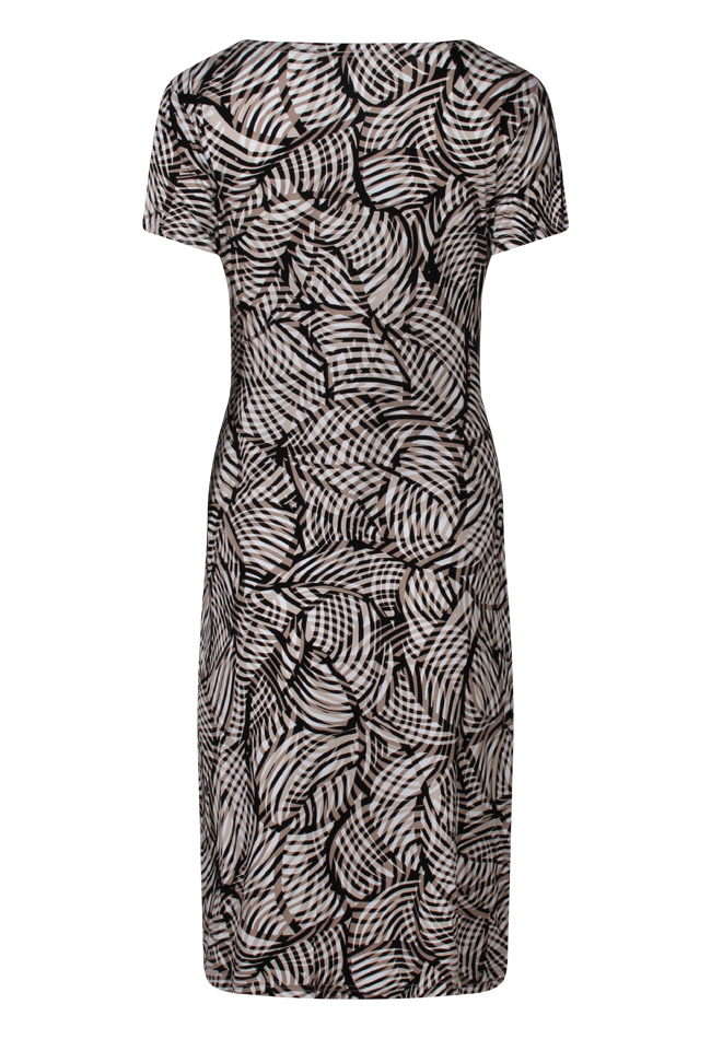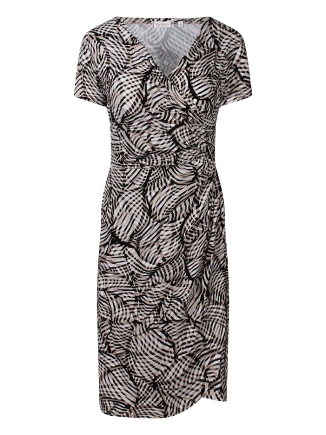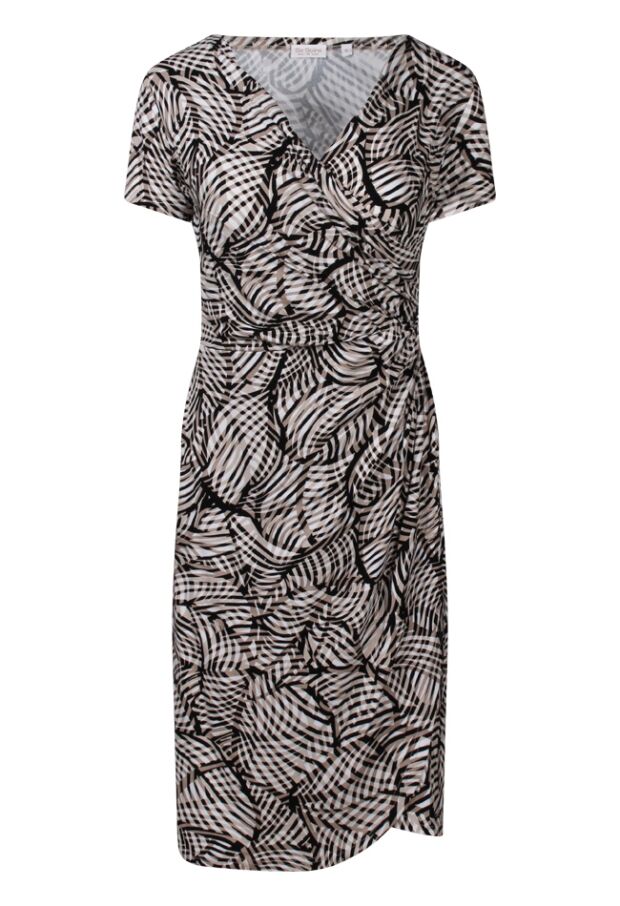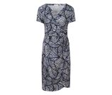 Deze zomerse damesjurk van So Soire met een grafische bladprint heeft een elegante V-hals, korte mouwen en een flatterend overslagmodel met strikdetail in de taille. Perfect voor een stijlvolle daglook of een informeel zomerfeest.