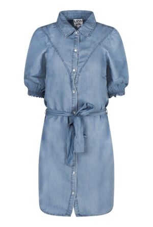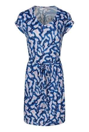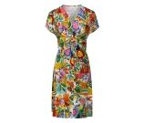De jurk heeft een vrouwelijke V-hals, korte mouwen en een speels knoopdetail aan de voorkant. Dankzij het strikdetail in de taille kun je de jurk mooi tailleren, wat zorgt voor een flatterende pasvorm.