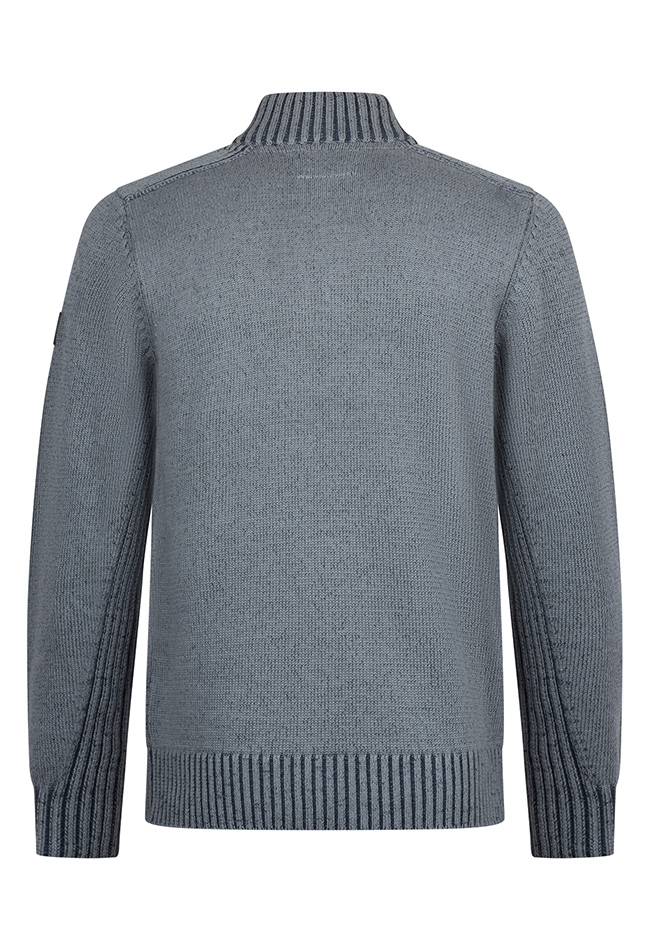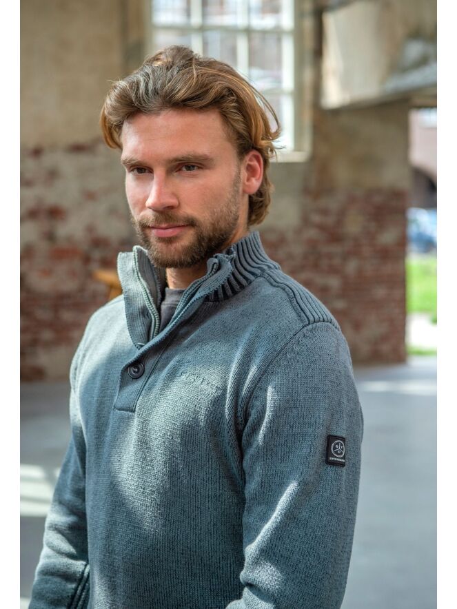 Warme pullover met dubbele kraag met rits en knopen. Deze trui draag je eenvoudig over een T-shirt maar doet het ook goed over een net overhemd voor een casual nette afgeklede look.