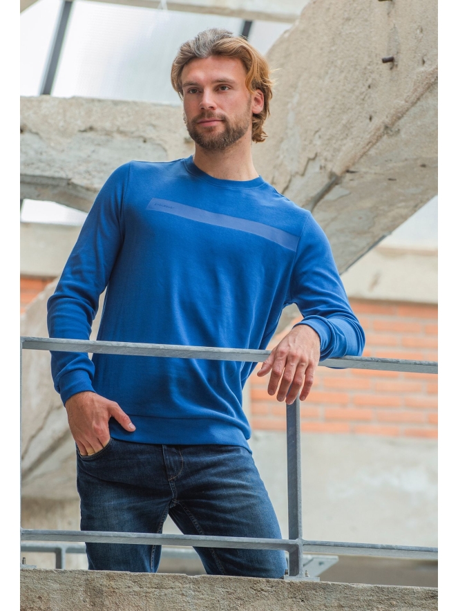 Effen sweater met een geprinte baan over de borst. Verder geen oespas, gewoon een fijne sweater.