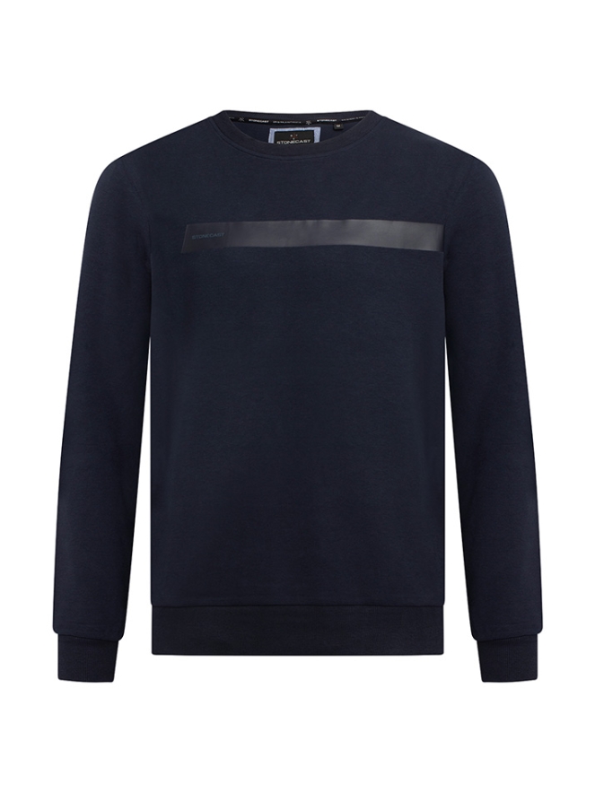 Effen sweater met een geprinte baan over de borst. Verder geen oespas, gewoon een fijne sweater.