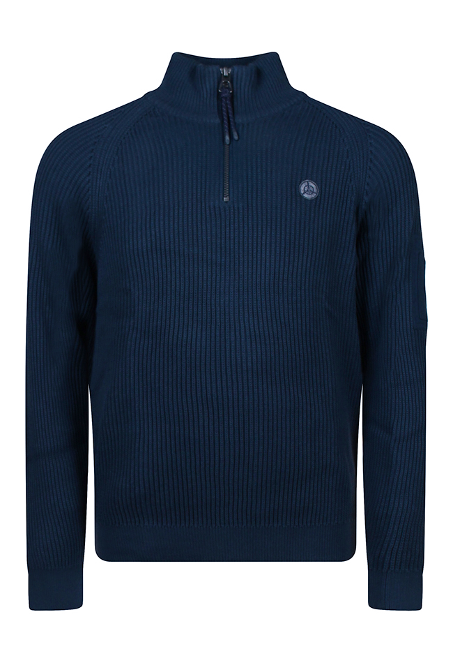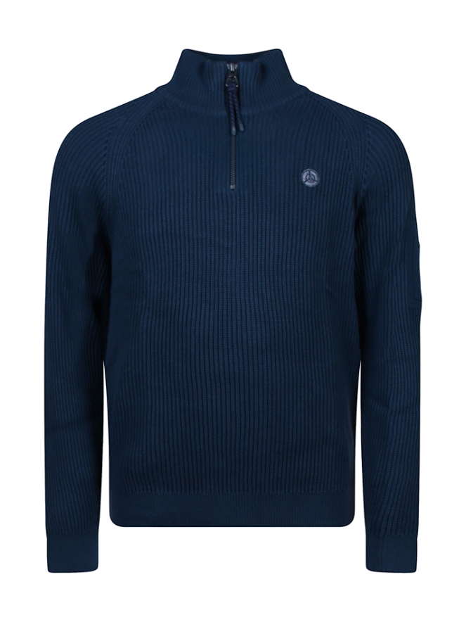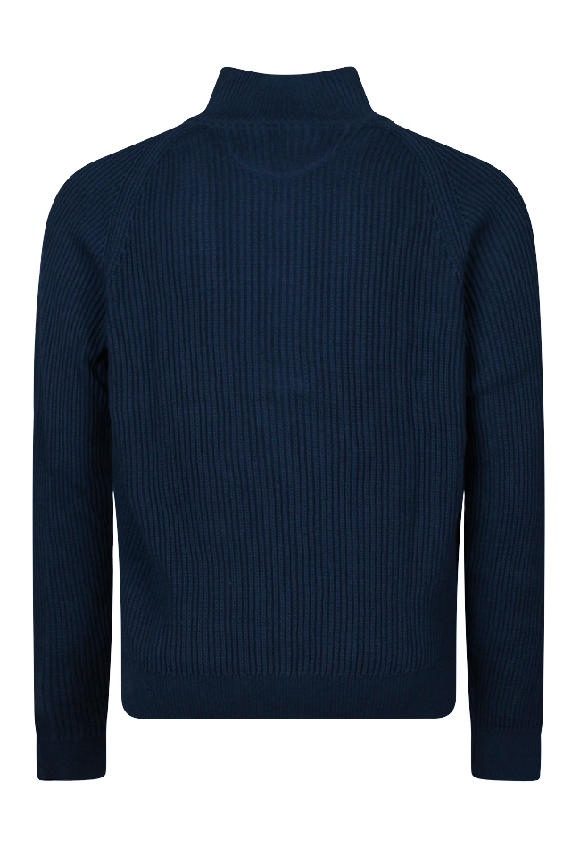 Deze herentrui met drie kwart rits heeft een hoge hals en is grof gebreid. Op de linker arm zit een (pennen) zakje.