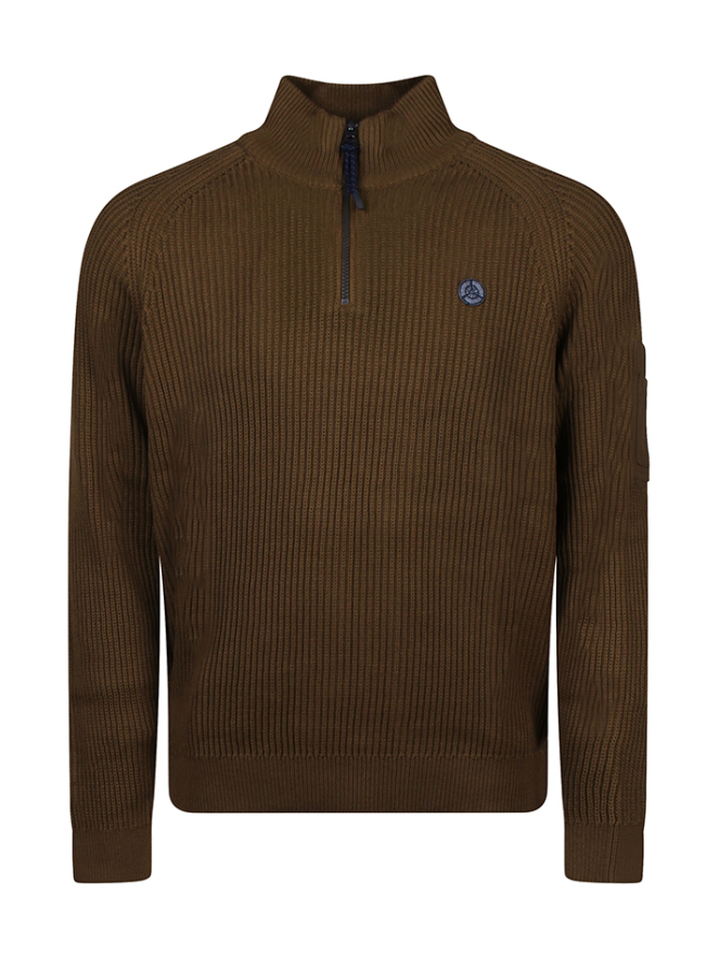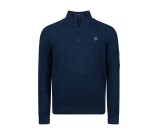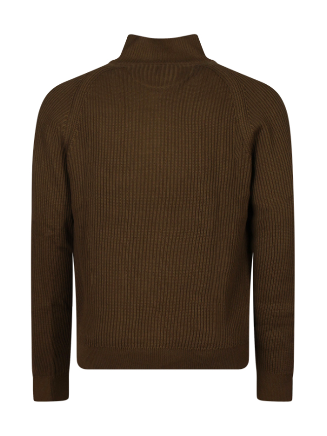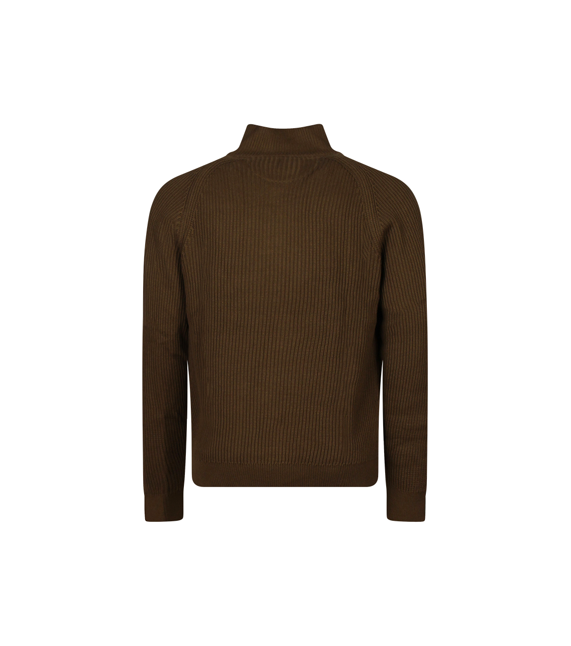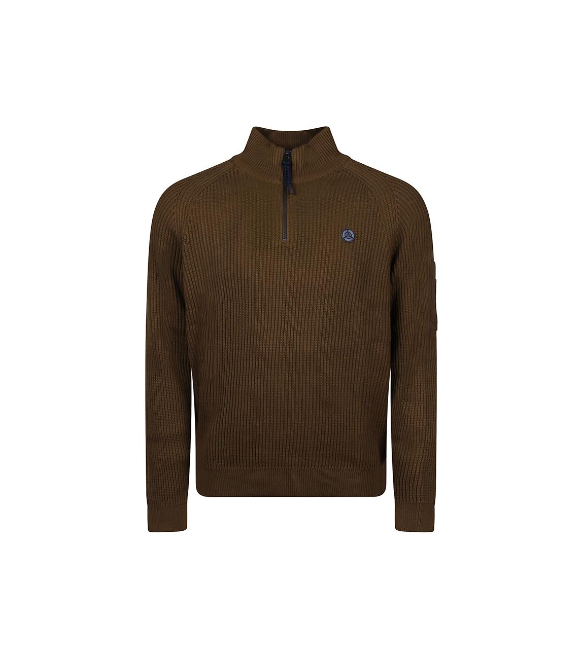 Deze herentrui met drie kwart rits heeft een hoge hals en is grof gebreid. Op de linker arm zit een (pennen) zakje.