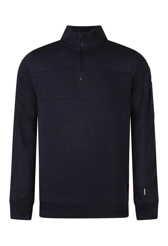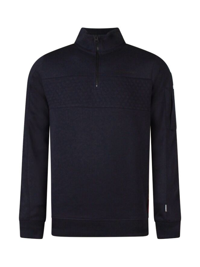 Sweater met 1/4 rits, jacquard details en zakje op de mouw. Heerlijk comfortabel en casual. Voor naar je werk, supermarkt of verjaardag!
