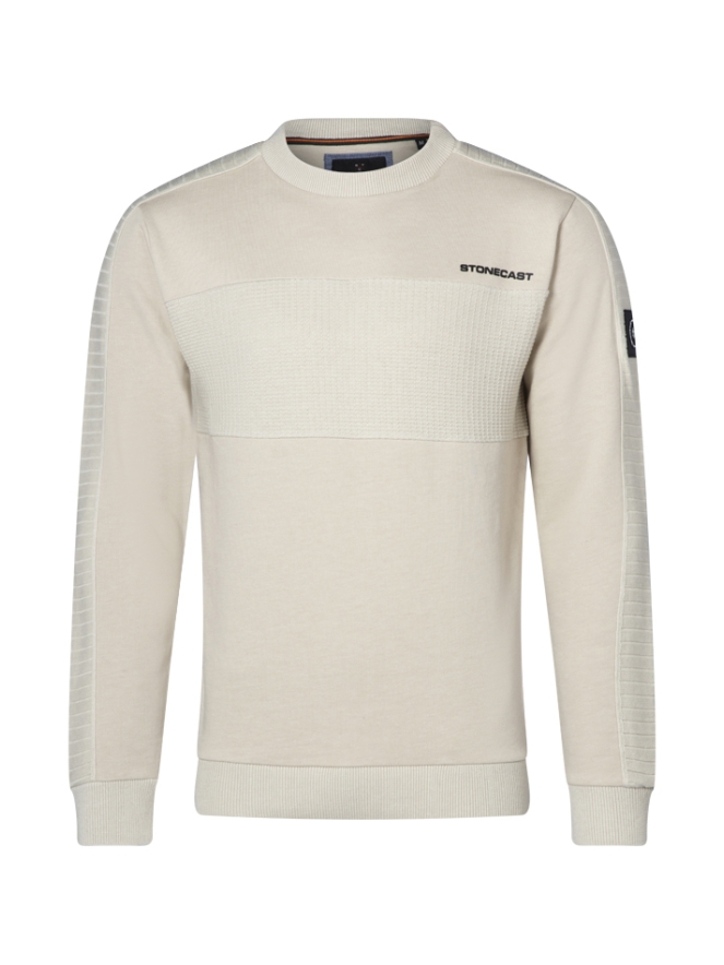 Deze sweater heeft een brede baan over het voorpand lopen lijkend op wafelkatoen. Ook over de mouwen loopt een baan in een andere stofstructuur. Dat maakt deze trui net even anders!