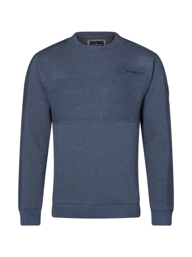 Deze sweater heeft een brede baan over het voorpand lopen lijkend op wafelkatoen. Ook over de mouwen loopt een baan in een andere stofstructuur. Dat maakt deze trui net even anders!