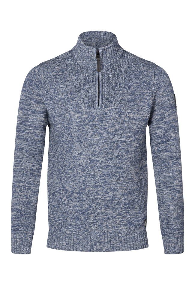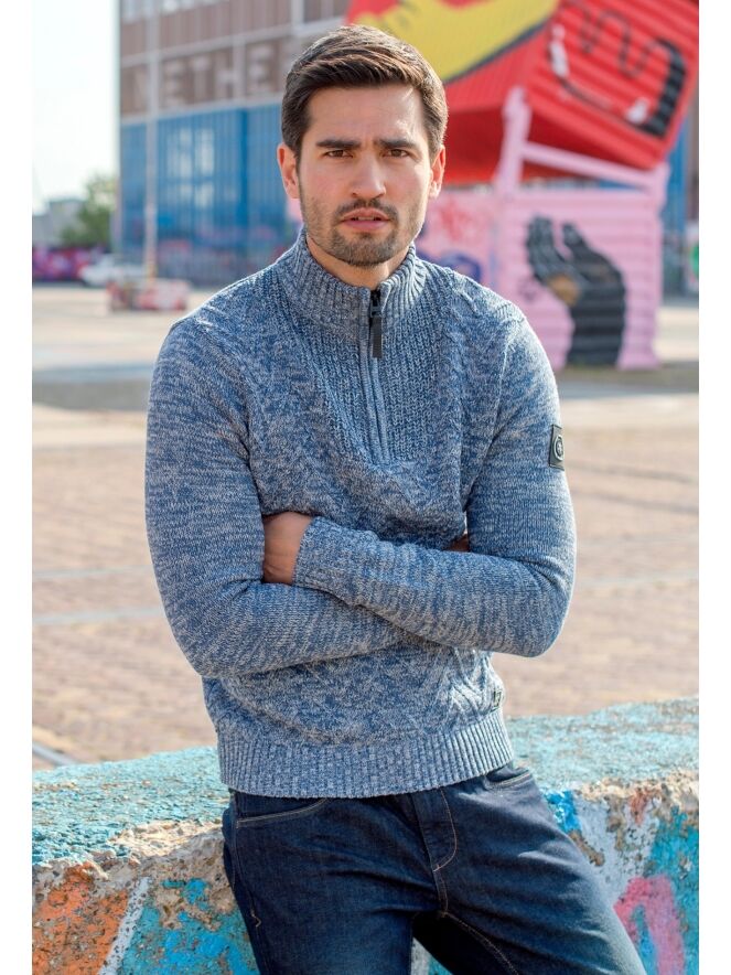 Warme kabeltrui met een driekwart rits. Met warme col. Tijdloos model en helemaal van deze tijd!