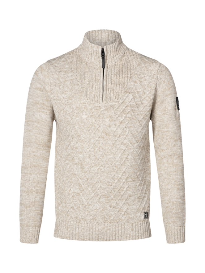 Warme kabeltrui met een driekwart rits. Met warme col. Tijdloos model en helemaal van deze tijd!