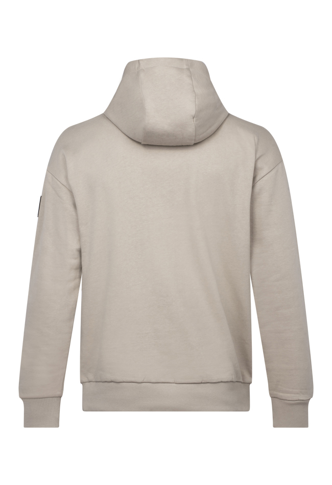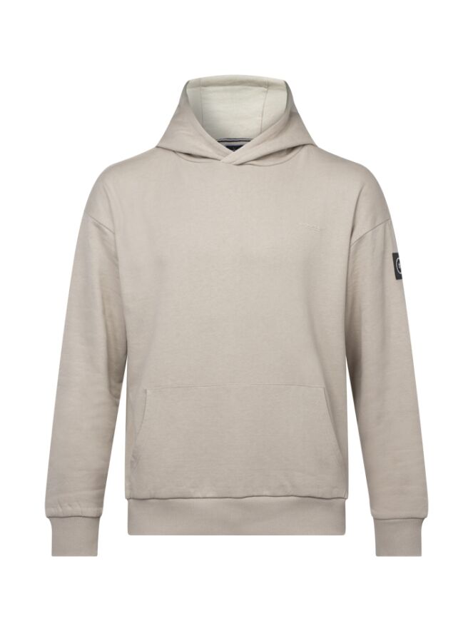 Heren hoodie met kangeroezak, capuchon, embleem op de mouw en kleine tekst print op de borst.