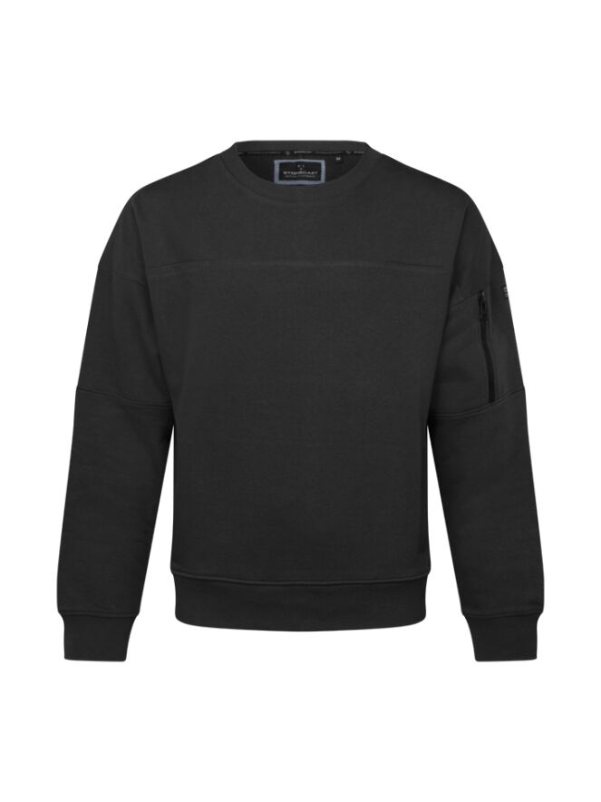 Deze heren sweater is een oversized model en heeft een doorlopende zak voorop. Op de bovenarm zit nog een ritszak. Verder weinig poespas. Gewoon een comfortabele sweater.