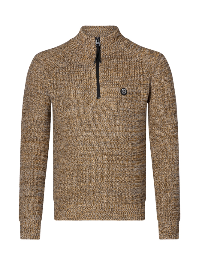 Warme gebreide trui met driekwart rits. Rits dicht betekend een warme col! Het garen van deze trui bestaat uit 3 kleuren zoals op de detail foto goed is te zien.