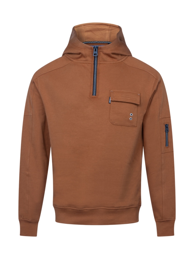 Heren hoodie met capuchon en ritssluiting perfect voor dagelijks gebruik. Op de borst zit een handige klepzak en op de mouw zit een ritszak met een embleem.
