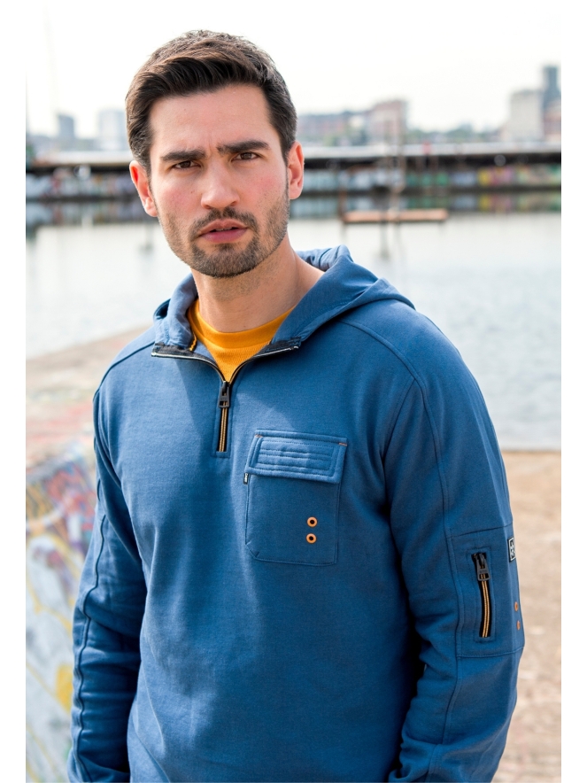 Heren hoodie met capuchon en ritssluiting perfect voor dagelijks gebruik. Op de borst zit een handige klepzak en op de mouw zit een ritszak met een embleem.