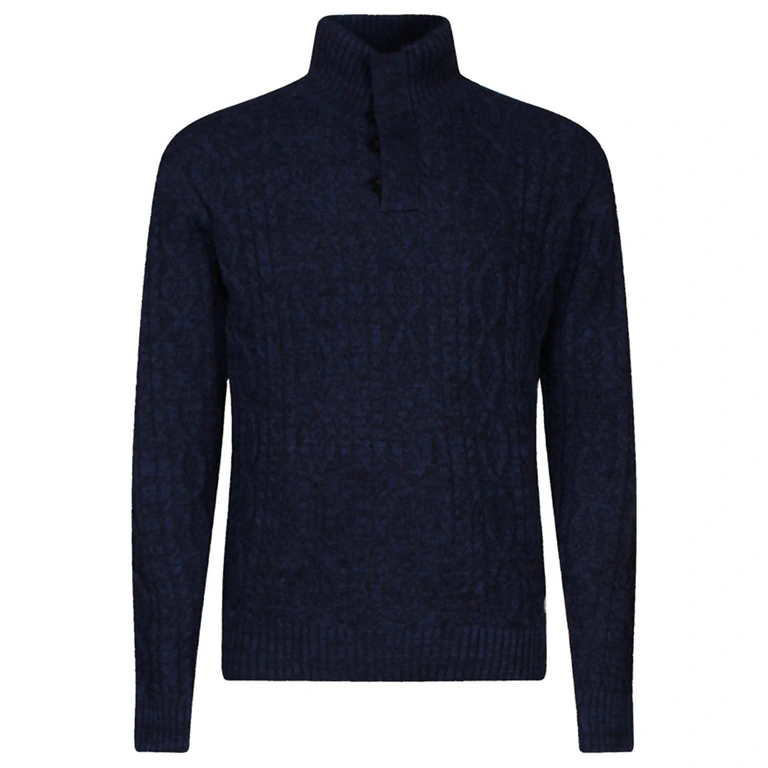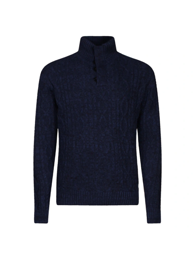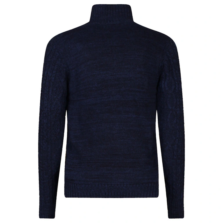 Warme kabeltrui voor heren met knoopsluiting. De trui bestaat uit 2 kleuren garen. Donkergroen met zwart. Oker met donkergrijs of kobalt met donkerblauw.