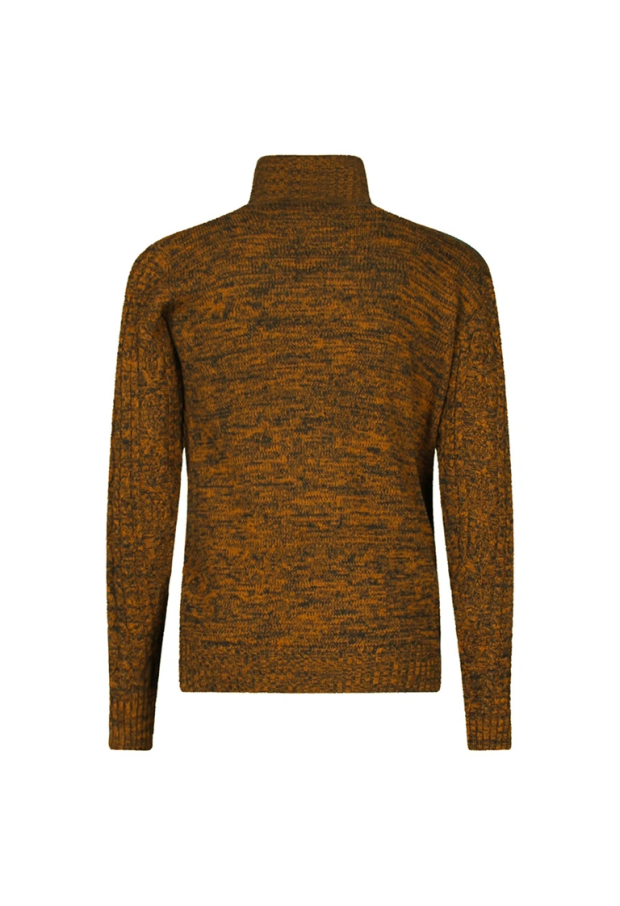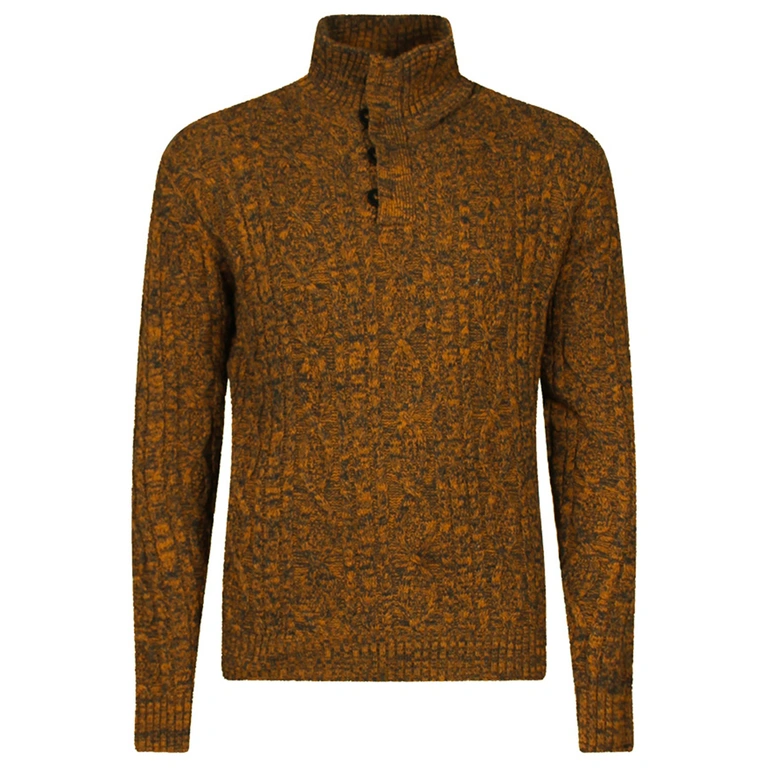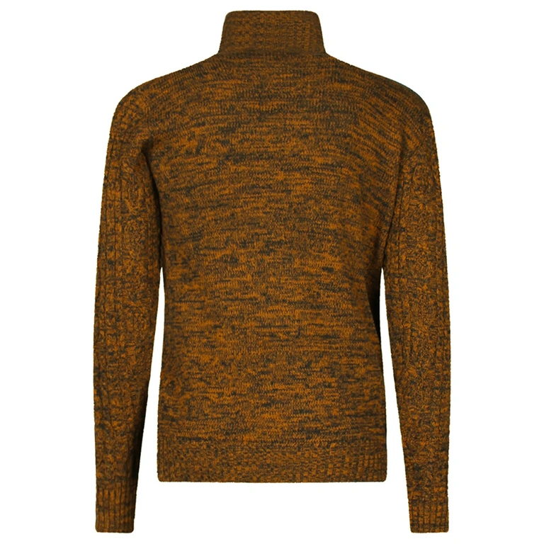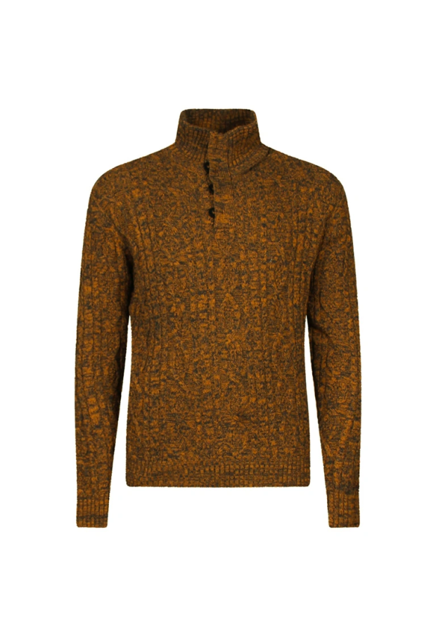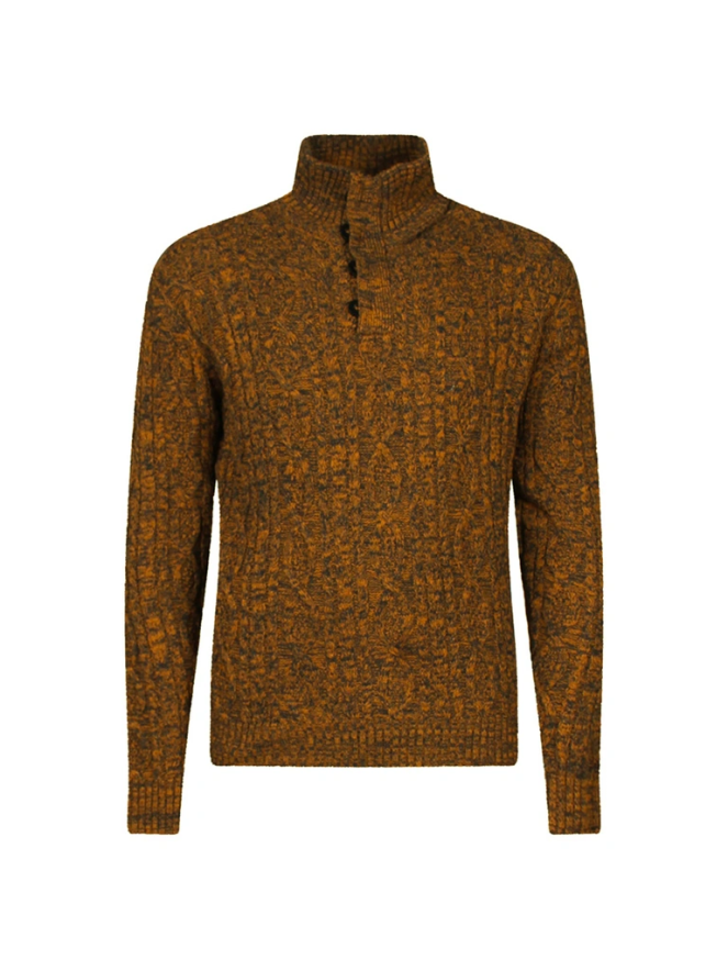 Warme kabeltrui voor heren met knoopsluiting. De trui bestaat uit 2 kleuren garen. Donkergroen met zwart. Oker met donkergrijs of kobalt met donkerblauw.
