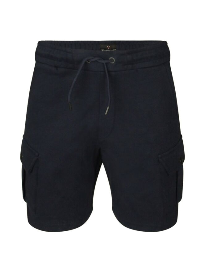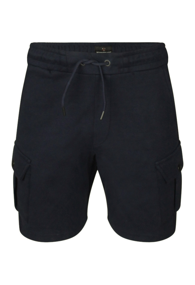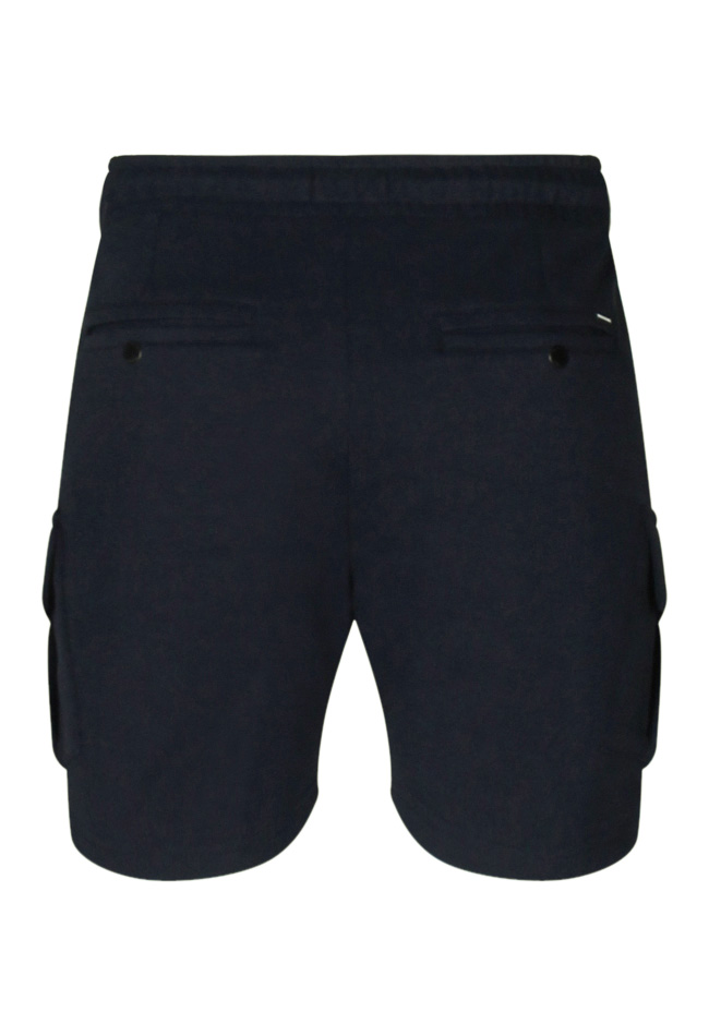 Deze jogging short heeft twee zijklep zakken, twee steekzakken en twee paspelzakken achterop met drukknoop. In de taille zit elastiek met een koord.
