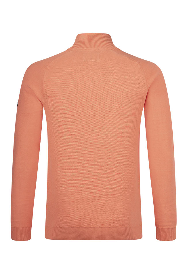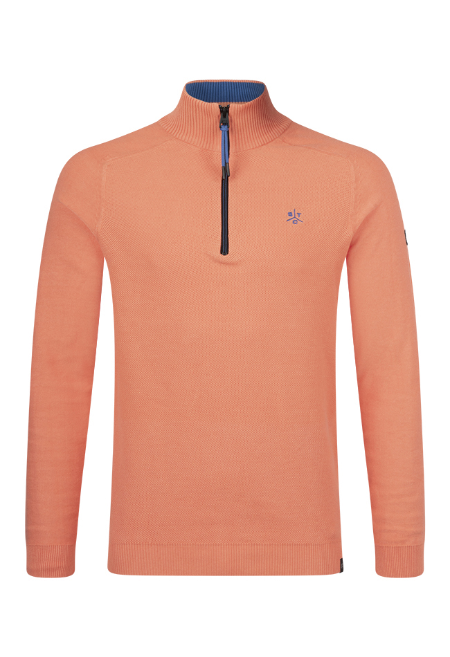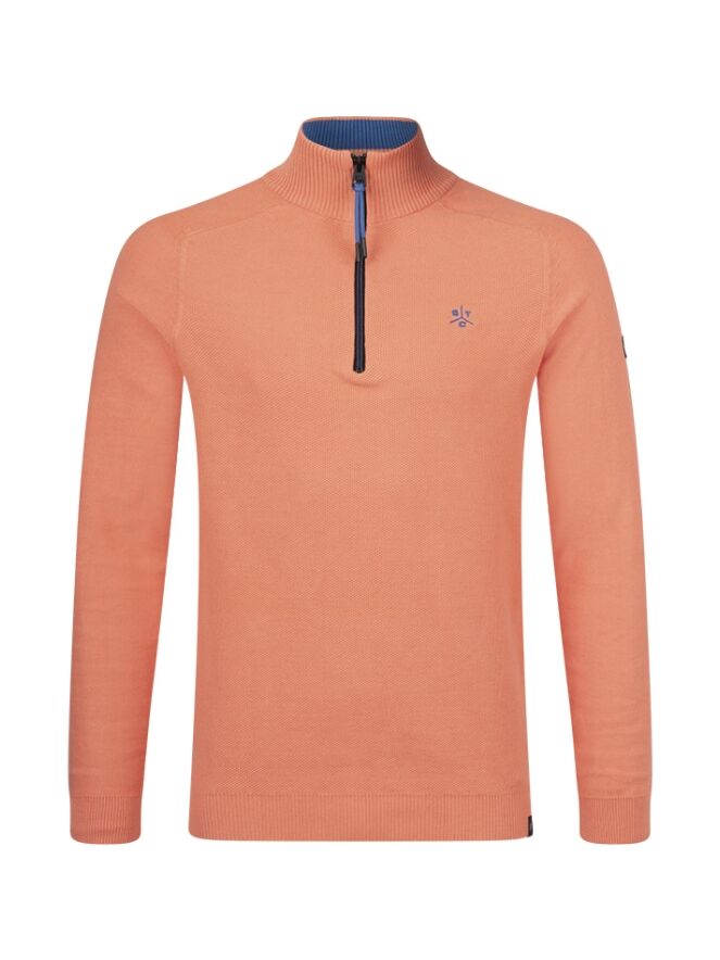 Deze trui heeft een opstaande kraag en een driekwart rits.