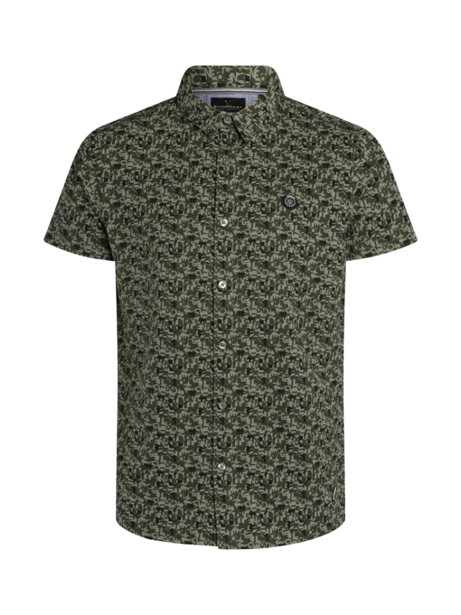 Dit overhemd met korte mouw van 'poloshirt stof' heeft een opvallende allover print en doet het erg goed op een effen gekleurde korte broek of een mooie jeans kort of lang.