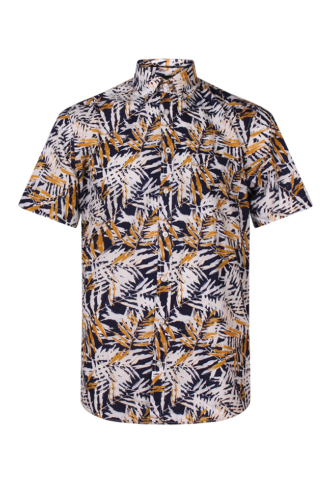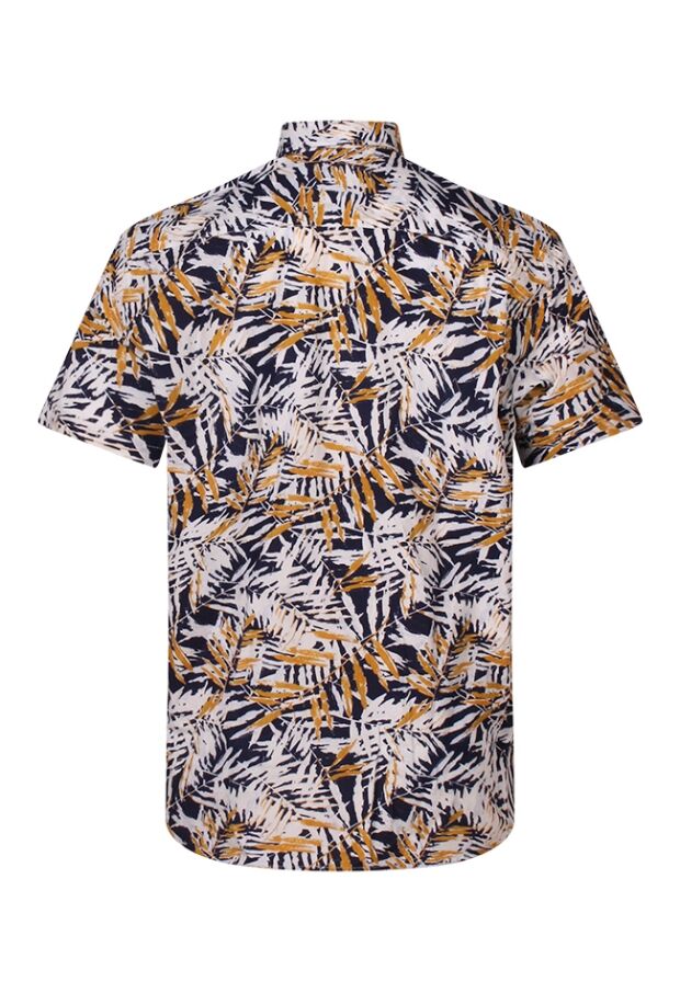 Dit herenoverhemd van Stonecast is een stijlvolle aanvulling op je zomergarderobe. Gemaakt van 100% katoen in een luchtige kwaliteit en uitgevoerd met een bladerdessin in marineblauw en okergeel, combineert dit overhemd comfort met een moderne, zomerse uitstraling. De klassieke button-down kraag, korte mouwen en regular fit zorgen voor een relaxte en verzorgde pasvorm, terwijl het borstzakje en de knoopsluiting het ontwerp compleet maken. Perfect om te dragen met een chino of short voor een casual, maar verzorgde look. Dankzij de ademende katoenstof is dit overhemd ideaal voor warme dagen.