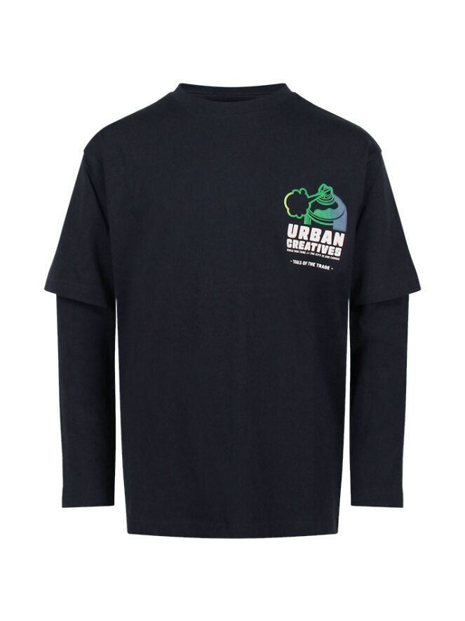 Stoer T-shirt met een dubbele mouwinzet en mooie graffiti prints op de voor een achterkant. Dit shirt laat zich goed combineren met mooie sneakers een spijkerbroek en bij kouder weer een overshirt eroverheen.