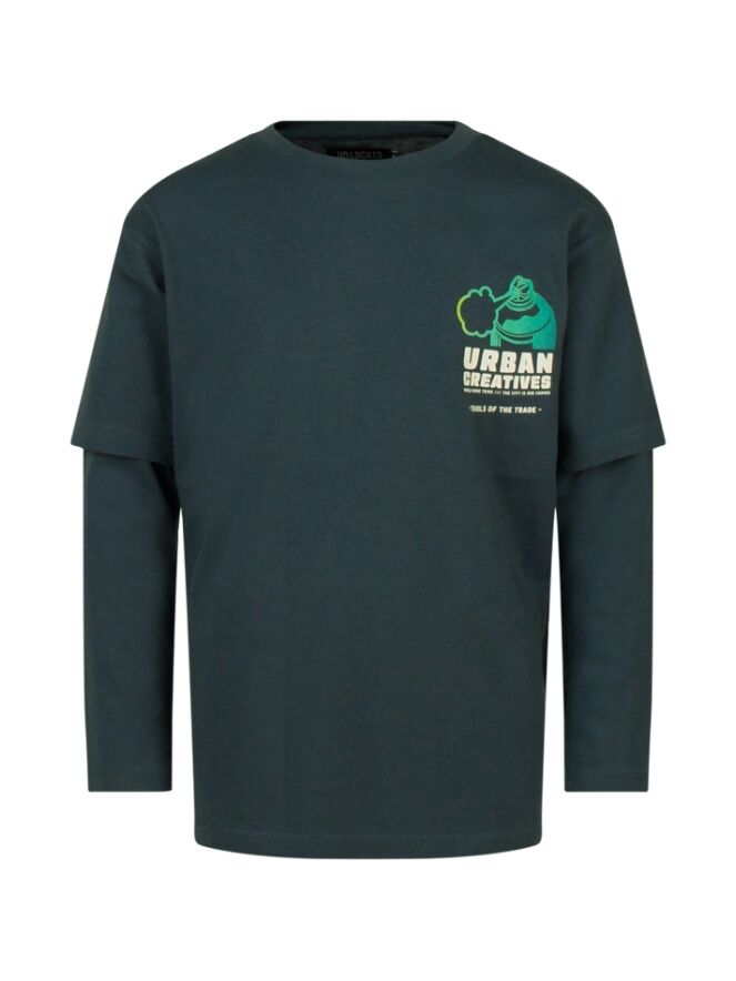 Stoer T-shirt met een dubbele mouwinzet en mooie graffiti prints op de voor een achterkant. Dit shirt laat zich goed combineren met mooie sneakers een spijkerbroek en bij kouder weer een overshirt eroverheen.