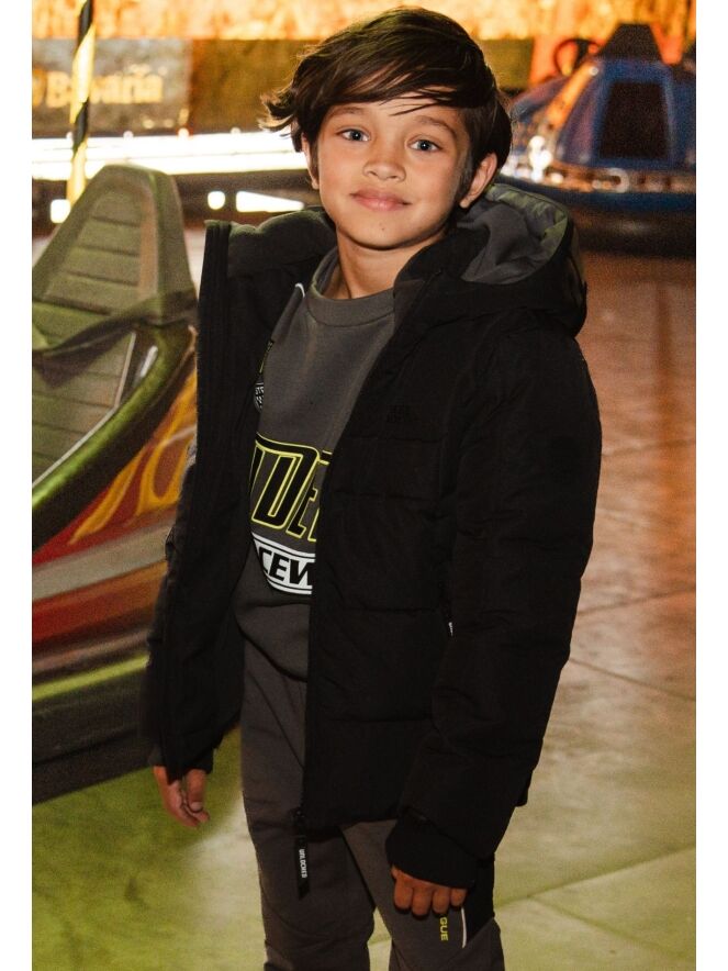 Deze stoere jongensjas heeft een matte look en een capuchon met een opvallende tekstprint. De jas is gevoerd met een zachte fleece binnenkant voor extra warmte en comfort. Verder heeft hij praktische ritszakken, een binnenzak en duimgaten in de boorden van de mouwen. Op de borst staat een coole tekstprint en op de mouw zit een stoere patch. Een ideale jas voor frisse dagen met een sportieve, eigentijdse uitstraling.