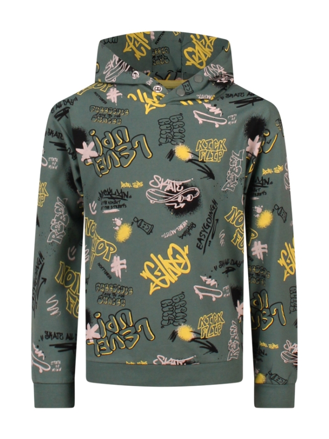 Fijne hoodysweater waar je lekker in weg kan duiken! De drukke graffiti print zit vol met tekeningen en teksten. Voor stoere boys!