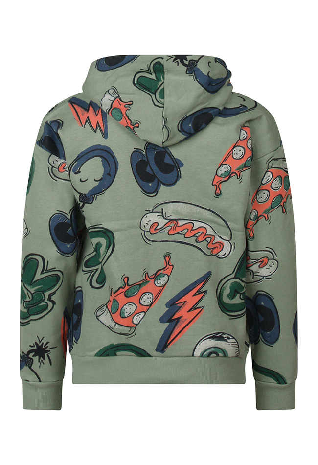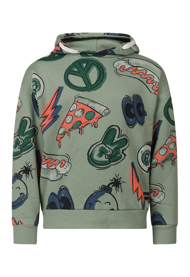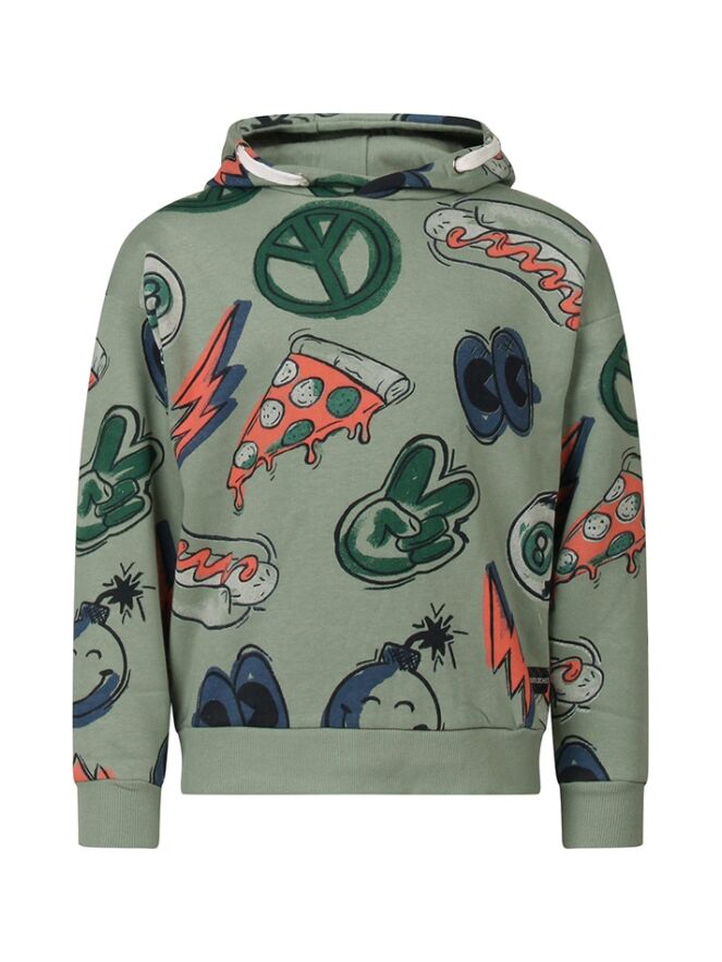 Streetstyle alert! Deze jongens hoodie heeft een all-over graffitidessin met coole prints zoals een peace-teken, pizza slice en nog veel meer. Gemaakt van zachte sweatstof en voorzien van een capuchon voor een extra stoere look. Perfect voor boys die houden van kleur, fun en comfort in een outfit. Lekker opvallend en heerlijk om te dragen!