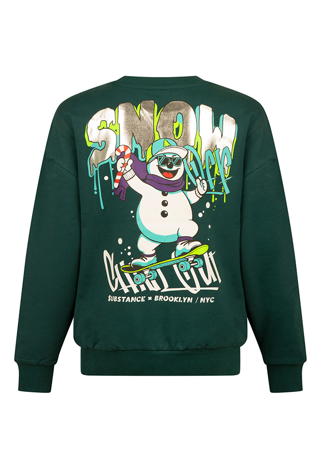 Sweater voor jongens met een vrolijke sneeuwpopprint op de achterkant en een kleinere print op de voorkant. Comfortabel en stijlvol, perfect voor de winterdagen.