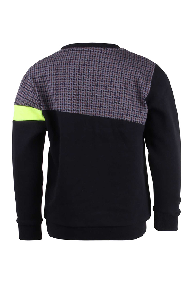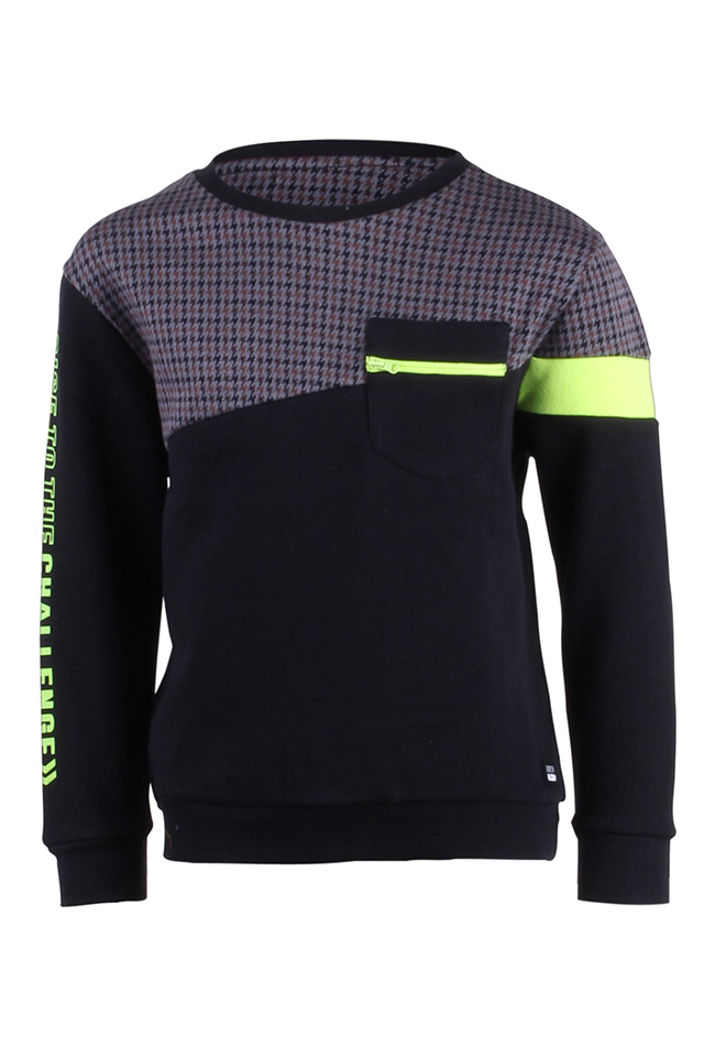 Trui van Unlocked. De trui heeft een pied de poule bovenkant en een effen onderkant. Er zitten neon letters op de mouw en details op de rest van de trui. Materiaal: 85% katoen, 15% polyester. Wassen op 30 graden, niet bleken, niet in de droger, kan gestreken worden.