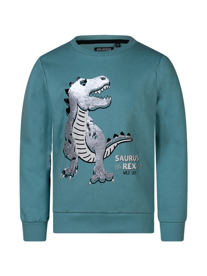 Sweater met lange mouwen. Deze trui heeft een dino print met pailletten die een andere kleur krijgen als je er met de hand over strijkt!