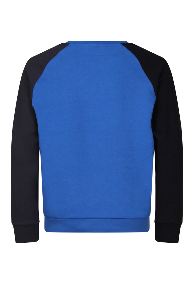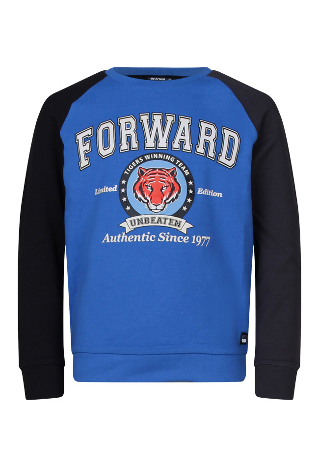 Twee kleurige sweater met lange raglan mouwen. Op de voorkant staart een geplaatste print met een tijgerkop.
