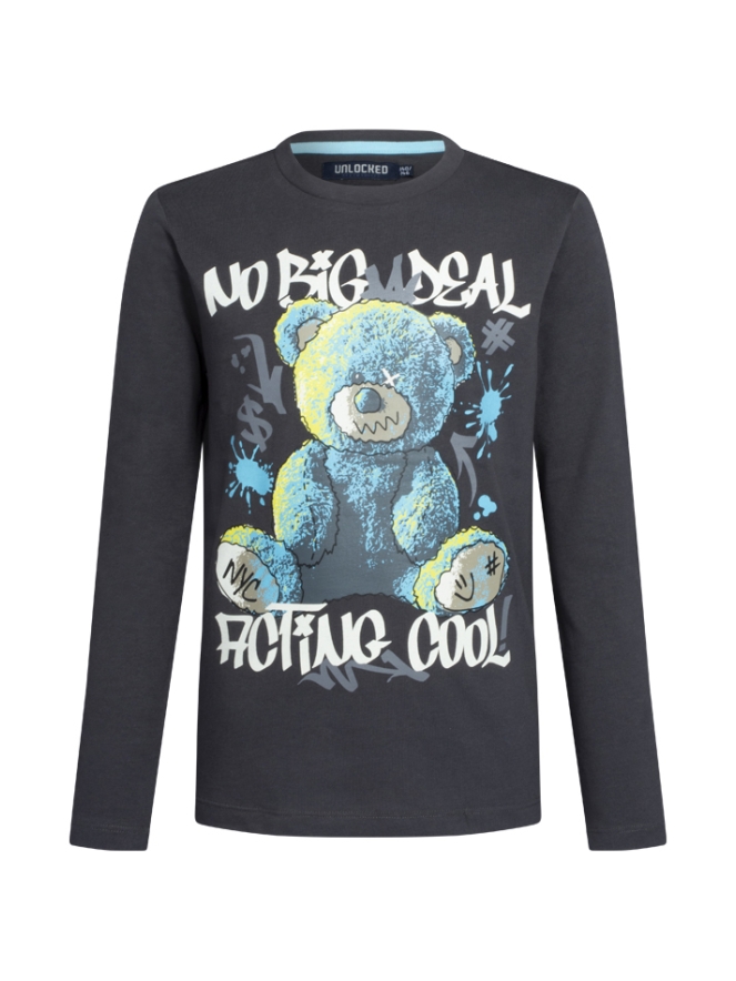 Dit jongens T-shirt met lange mouwen heeft een grote print van een tekst en een beer op de voorkant. Ideaal voor een stoere look.