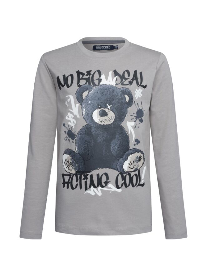 Dit jongens T-shirt met lange mouwen heeft een grote print van een tekst en een beer op de voorkant. Ideaal voor een stoere look.