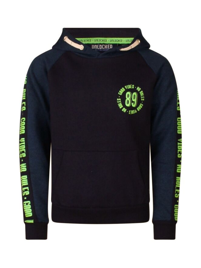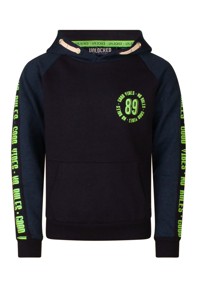 Weer zo'n leuke hoodie sweater van Unlocked met gemeleerde inzetten in de mouwen en capuchon. Verschillende prints vind je op de hele lengte van de mouwen en voor op de borst. Voor de casual look, voor naar school, om in te spelen of chillen. Kan allemaal!
