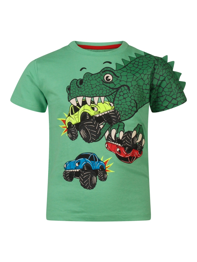 Een T-shirt dat elke kleine dino-fan laat roarrrr-en van plezier! Op dit T-shirt speelt een levendige dino vrolijk met auto?s, klaar om elk avontuur mee te maken. De gave details laten je zijn stekels op de arm voelen waardoor het echt tot leven komt.