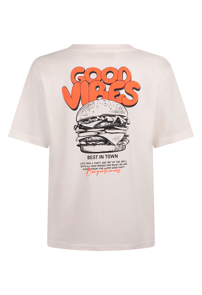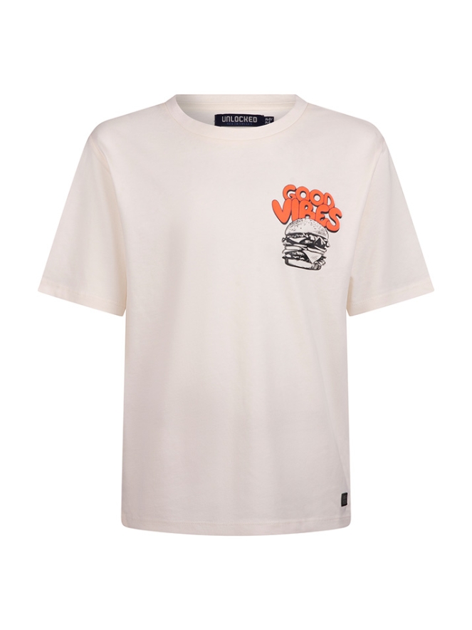 Geef elke outfit een speelse en trendy uitstraling met dit stoere jongens T-shirt van Unlocked. Dit shirt is uitgevoerd in een comfortabele regular fit met een licht boxy effect, waardoor het perfect zit en makkelijk te combineren is met elke casual look. Het T-shirt heeft een zachte feel en ademend draagcomfort, ideaal voor dagelijks gebruik. Op de borst vind je een opvallende puffprint van een burger met de tekst 'Good Vibes'. De achterkant maakt echt een statement met een grote foodprint van een burger en dezelfde vrolijke tekst. Dankzij de ronde hals en korte mouwen heeft dit shirt een tijdloze en veelzijdige uitstraling. Perfect voor jongens die houden van een coole, casual stijl met een speelse twist.