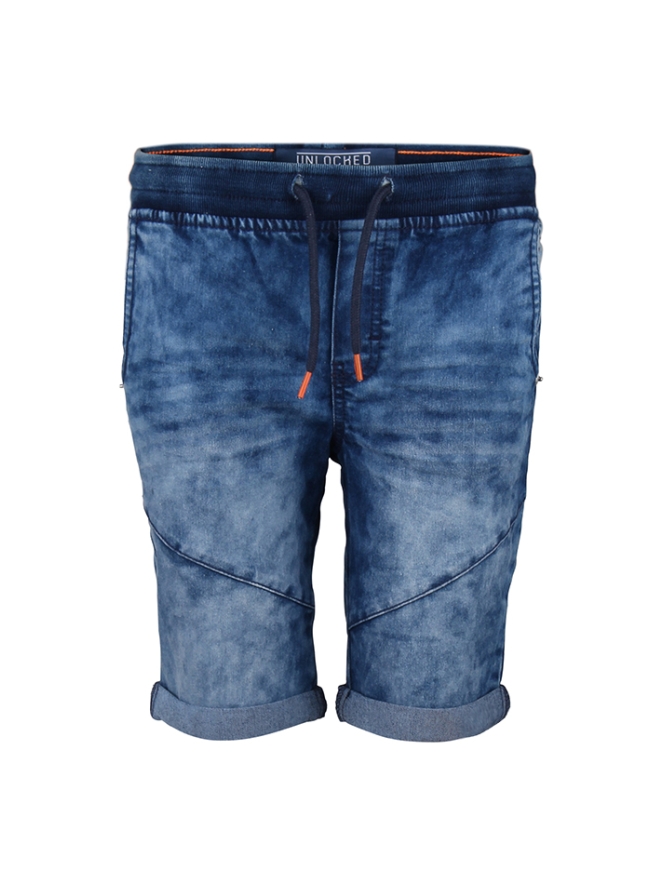 Jeans shorts van Unlocked. De shorts hebben omgerolde pijpen en een brei taille band met touwtje. Materiaal: 73% katoen, 25% polyester, 2% elasthan. Op 30 graden wassen, niet bleken, niet in de droger, kan gestreken worden.