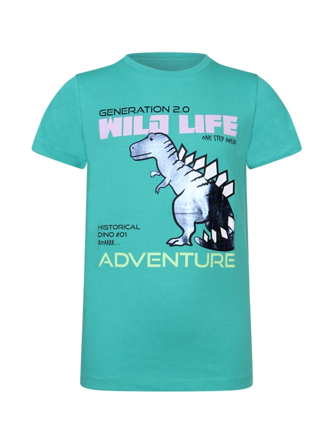 Dit avontuurlijke t-shirt heeft een ronde hals en korte mouwen. Op de voorkant staat een folie gedrukte dino met daar omheen tekst. Het t-shirt is verkrijgbaar in drie verschillende kleuren.