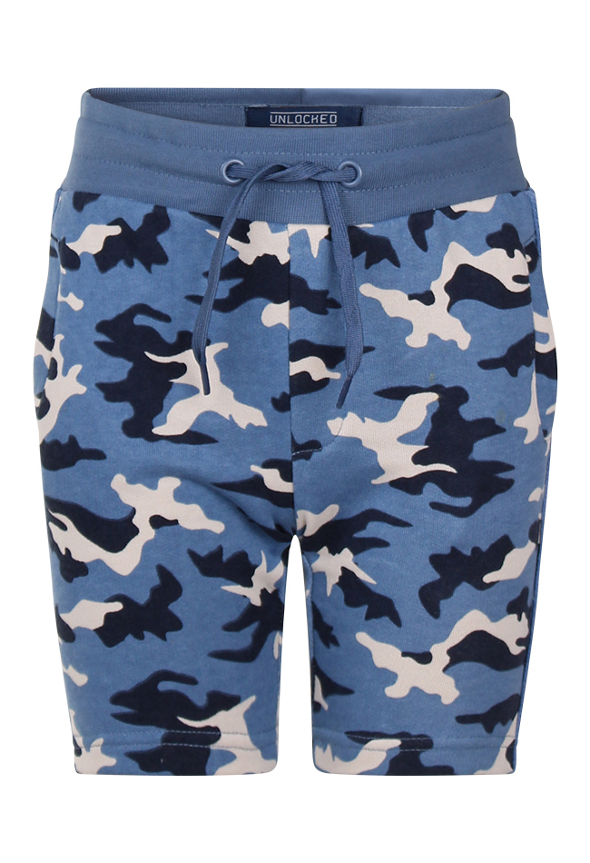 Sweat short met een allover camouflageprint een elastische tailleband met koord er doorheen en steekzakken.