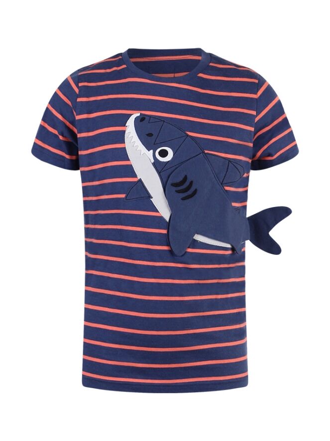Dit T-shirt met korte mouwen heeft een gestreept patroon. Op de voorkant zit een haai applicatie met flap. Als je de flap opent kun je zien wat de haai die dag gegeten heeft. Het T-shirt is verkrijgbaar in twee kleuren.