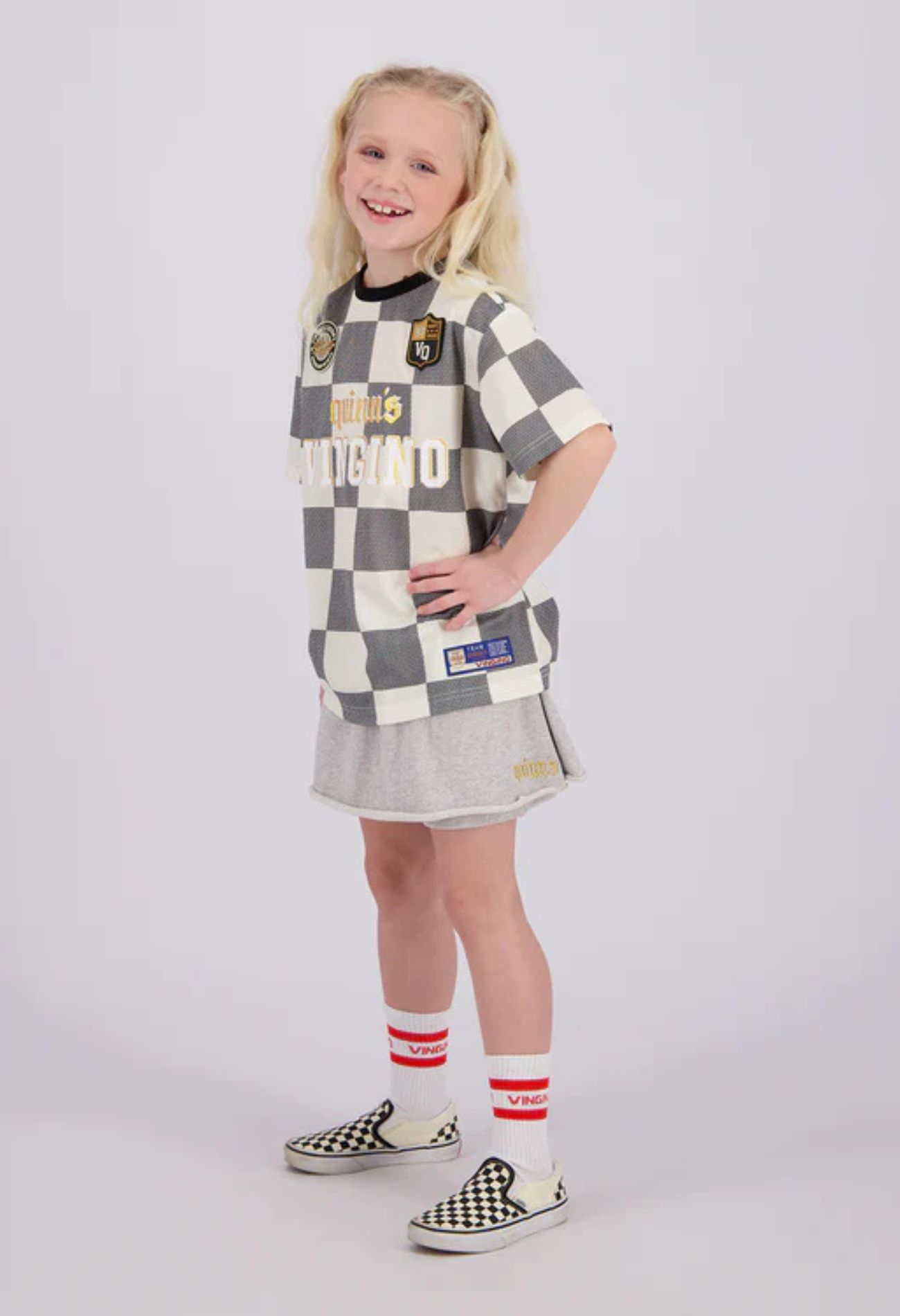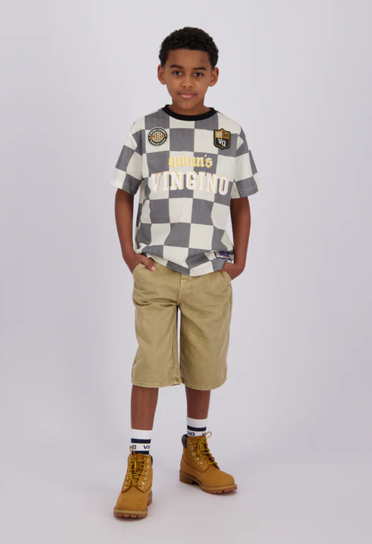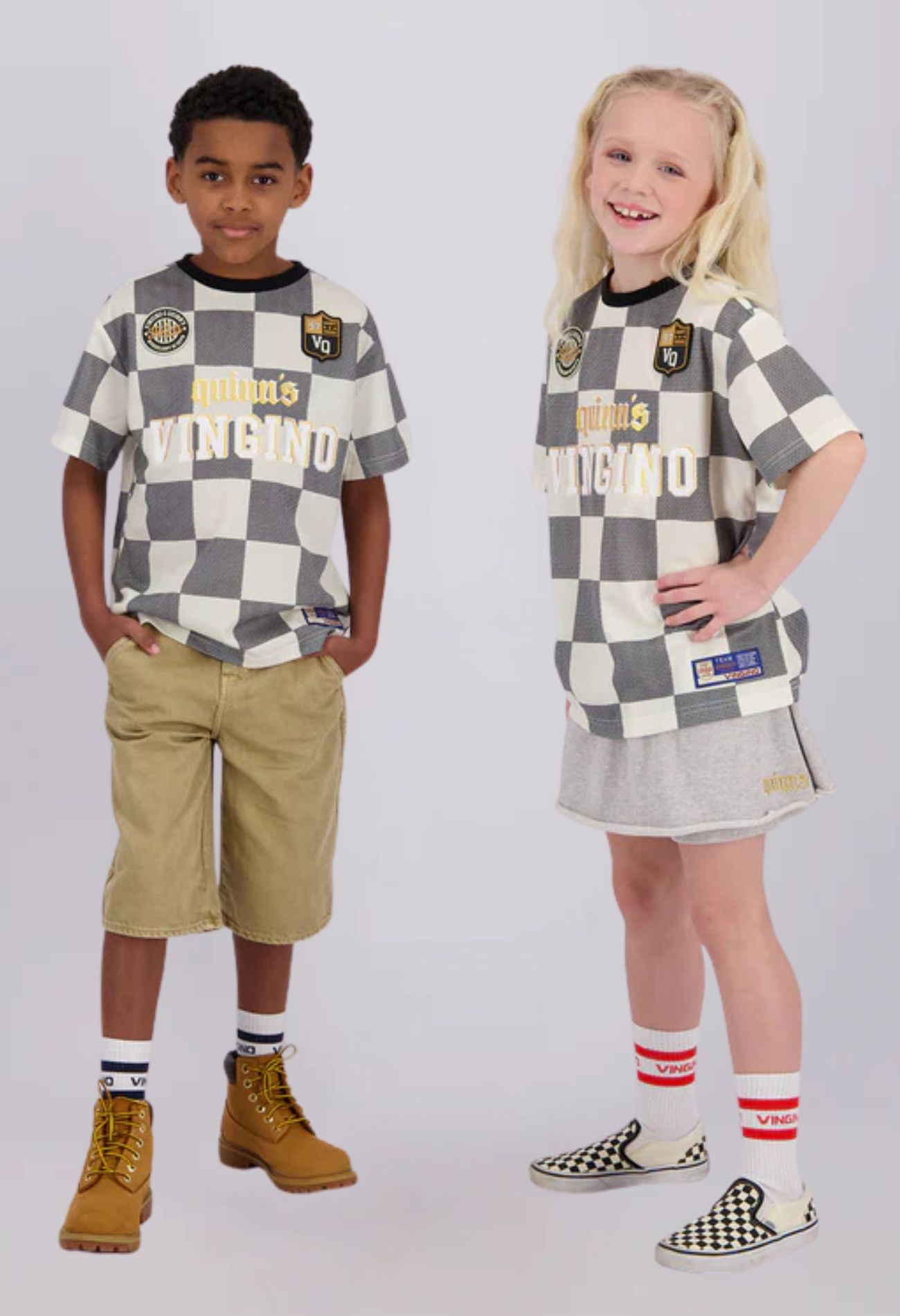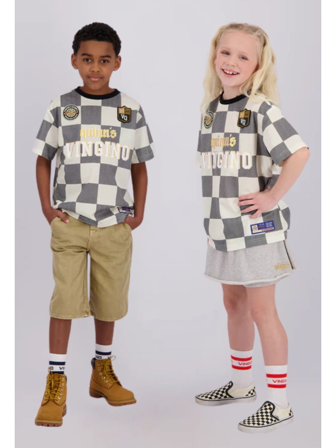 Laat je kind stralen met Hoga van Vingino. Dit zwarte checkered t-shirt is perfect voora alle jongens en meisjes. Met een oversized pasvorm is dit kledingstuk ideaal voor elke dag. Een topper uit de Vingino X Quinns lijn, klaar voor school en avontuur.