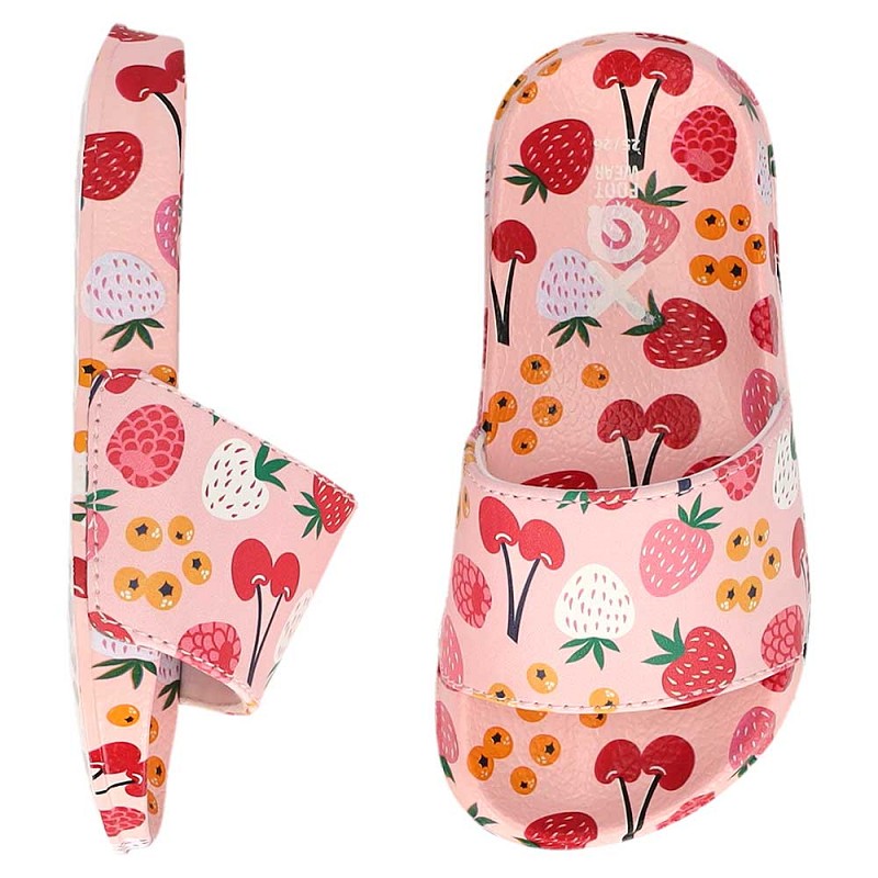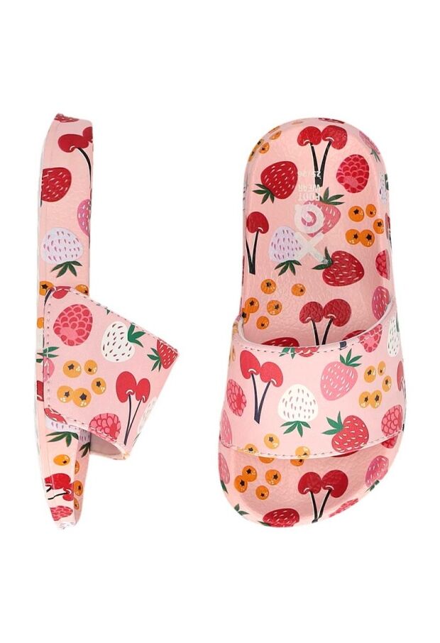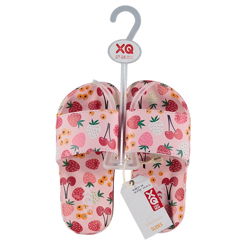Meisjes slipper van XQ Foot Wear. Deze badslipper heeft een allover roze fruit print met comfortabel voetbed.