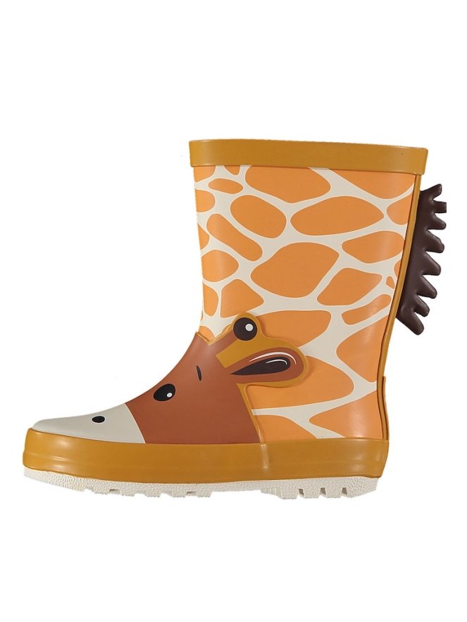 Giraffe regen laarzen. De laarzen hebben een giraffe print en een giraffe gezichtje.